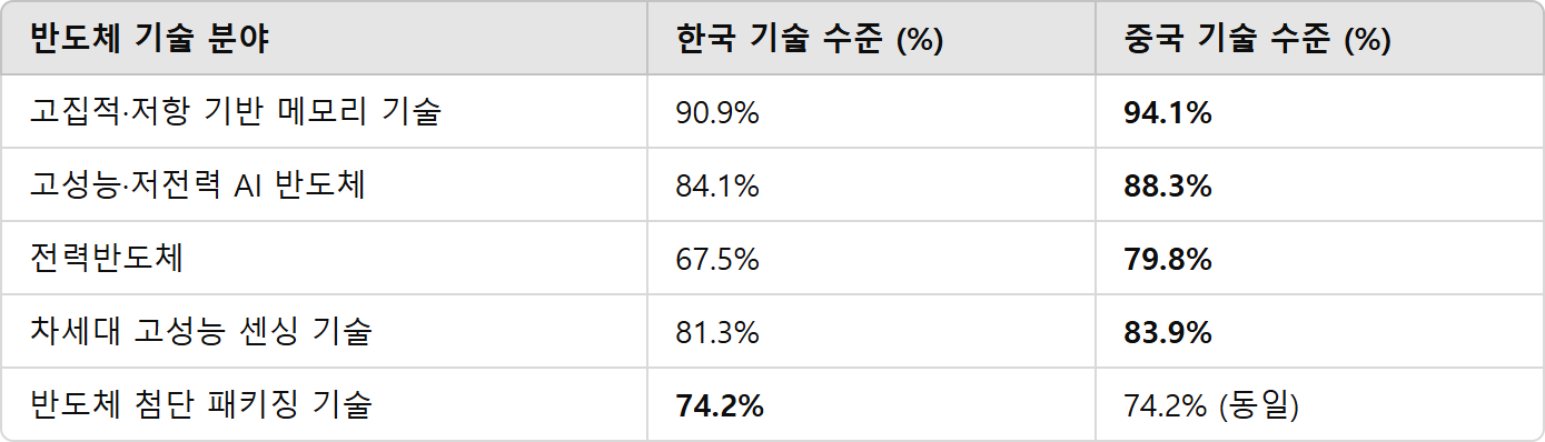 - AI 반도체, 전력반도체, 센싱 기술에서 중국이 한국을 앞섰다는 평가