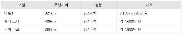 아토3의 주요 스펙 및 경쟁 모델과의 비교